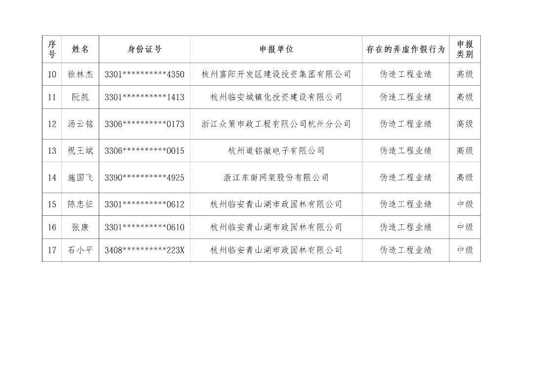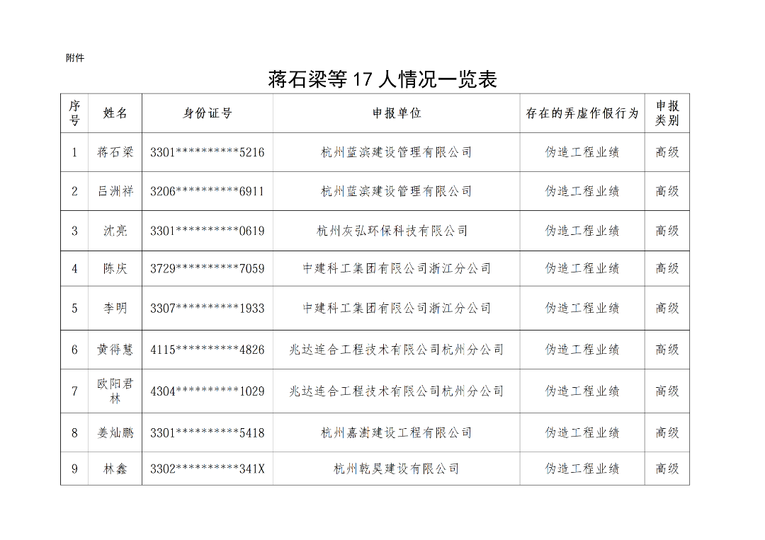 在2025年杭州市建设工程专业技术人员高、中级工程师资格评审过程中,经申报单位所在地建设行政主管部门调查和系统平台查重比对核实,蒋石梁等17人存在伪造、变造申报材料的行为。