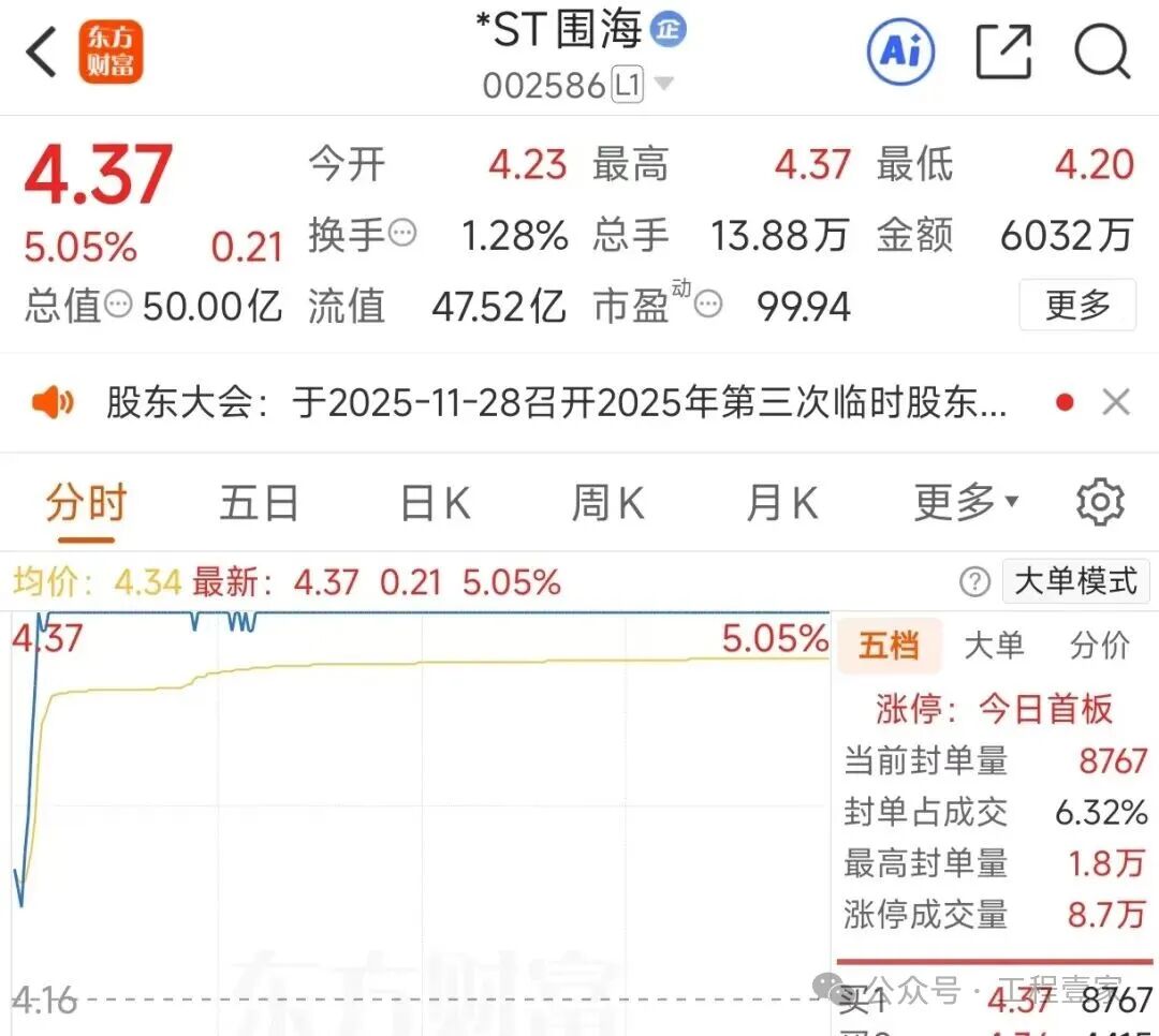 二级市场上,重审判决公告发布当日(11月13日),*ST围海股价涨停,报4.37元/股,最新市值约为50亿元。